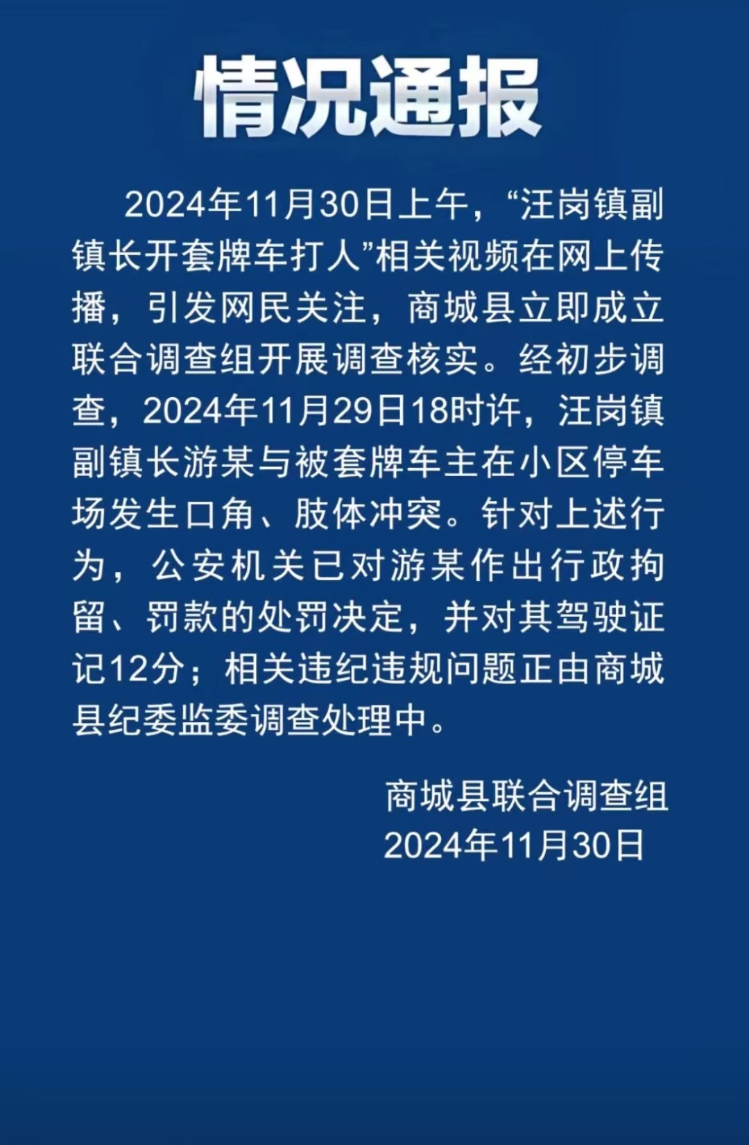 经初步访问,11月29日18时许,汪岗镇副镇长游某与被套牌车主在小区泊车场发生利害、肢体冲破。针对上述算作,公安机关已对游某作出行政拘留、罚金的处罚决定,并对其驾驶证记12分;联系违章违规问题正由商城县纪委监委访问不停中。